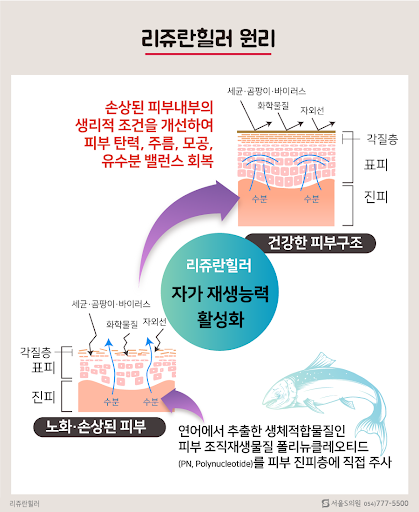 - 연어 DNA(PDRN) 성분을 주입해 피부 재생을 촉진.